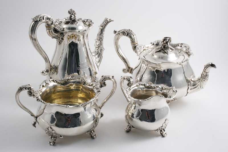 A George IV four piece tea & coffee service with circular baluster bodies, shaped foliate rims & leafy scroll feet, the pots with flower finials, each piece engraved with a script monogram, London 1827/28/29; the coffee pot 8.9" (22.8 cms) high; 80.5 oz (4)