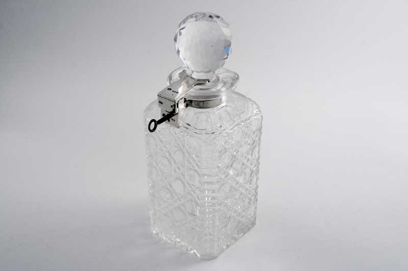 AN EDWARDIAN MOUNTED CUT GLASS "BETJEMANN'S PATENT" DECANTER & STOPPER with lock & key to secure closure, by C. Bejemann & sons, London 1907; 9.5" (24 cms) high