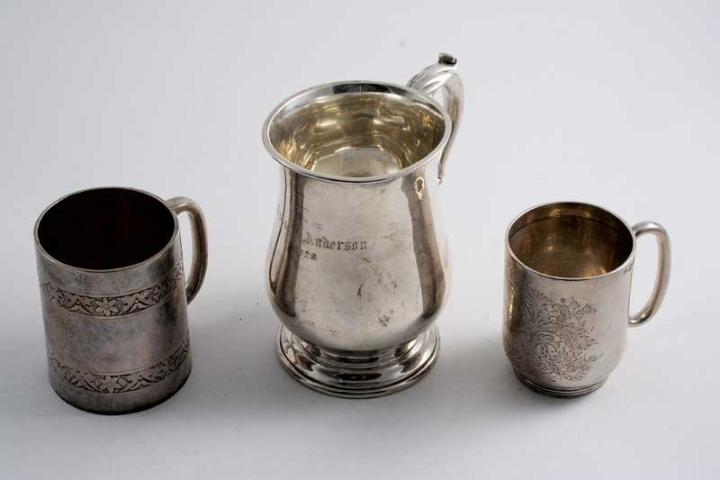inscribed, by S. Garrard, London 1929, a Victorian straight-sided christening mug with an upper & lower chased frieze, monogrammed, and a late Victorian engraved christening mug, inscribed; the baluster mug 5" (12.7 cms) high; 16.75 oz (3)