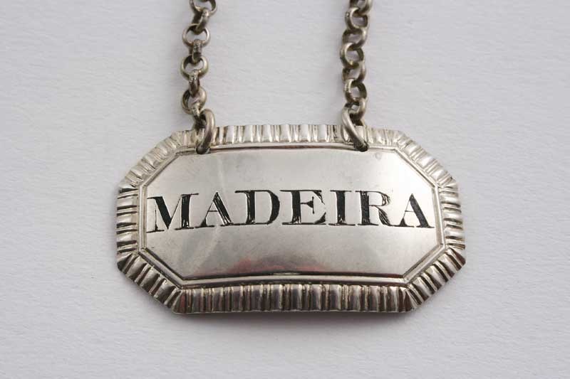 A WILLIAM IV CANTED OBLONG WINE LABEL with a gadrooned border, incised & filled "MADEIRA", by C. Rawlings & W. Summers, London 1883; 1.75" (4.5 cms) long; 0.3 oz