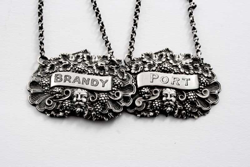 with a mask & fruiting vines, "PORT" & "BRANDY", by Joseph Taylor, Birmingham 1826; 1.8" (4.8 cms) long; 0.4 oz (2)