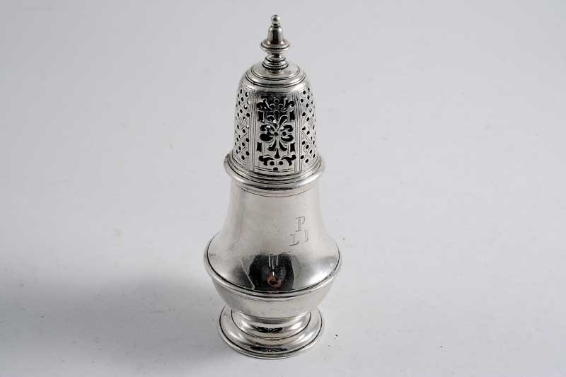 A GEORGE I IRISH CASTER of vase form, engraved on one side with the initials "P" over "LI", no maker's mark, Dublin 1715; 6.1" (15.3 cms); 6.3 oz