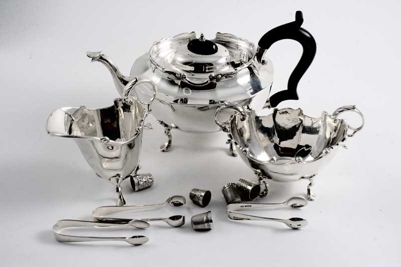 of p;anelled oval form with scrollwork rims & four feet, by Carrington & Co., London 1928 together with three small pairs of sugar tongs & five thimbles; the tea pot 5.7" (14.5 cms) high; 29 oz (11)