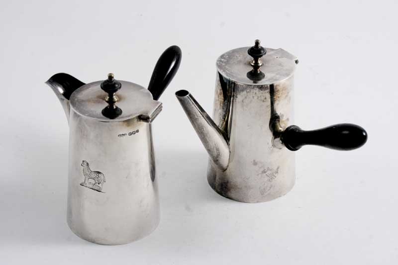 A PAIR OF TAPERING CAFE AU LAIT POTS with turned wooden handles, crested, by James Dixon & Sons, Sheffield 1928/29; 4.3" (11 cms) high; 11.4 oz (2)