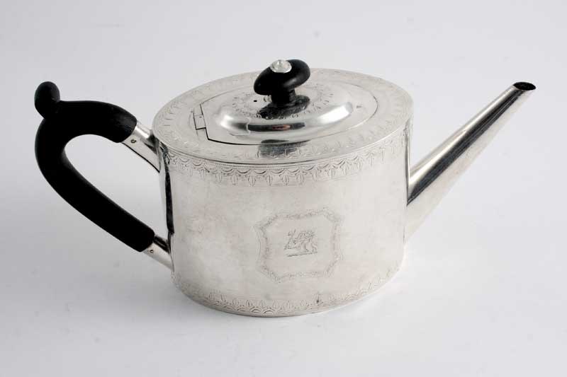 A GEORGE III ENGRAVED OVAL TEA POT with a slightly domed cover & a straight spout, crested, by Michael Plummer, London 1793; 5.4" (13.5 cms) high; 14 oz