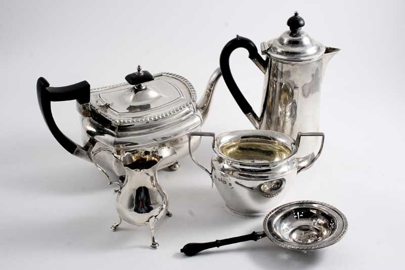 A tea pot of rounded oblong form by Walker & Hall, Sheffield 1927, a hot water jug, a tea strainer, a sugar basin & a small George III baluster milk jug; the latter 4" (10.2 cms) high; 40.6 oz (5)