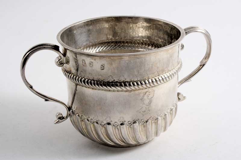 with two s-scroll handles, a wrythen-fluted lower body & an embossed ropework girdle, scratched "DS" underneath & "G" over "RS" on one side & initialled "G" on the other, by James Chadwick, London 1699; 3.9" (10 cms) high; 8.4 oz