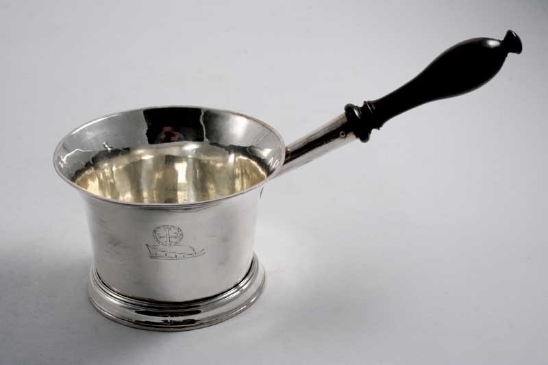A GEORGE II BRANDY SAUCE PAN with an everting rim & a turned wooden handle, crested, by Richard Kersill, London 1744; 3.75" (9 cms) diameter; 4.2 oz