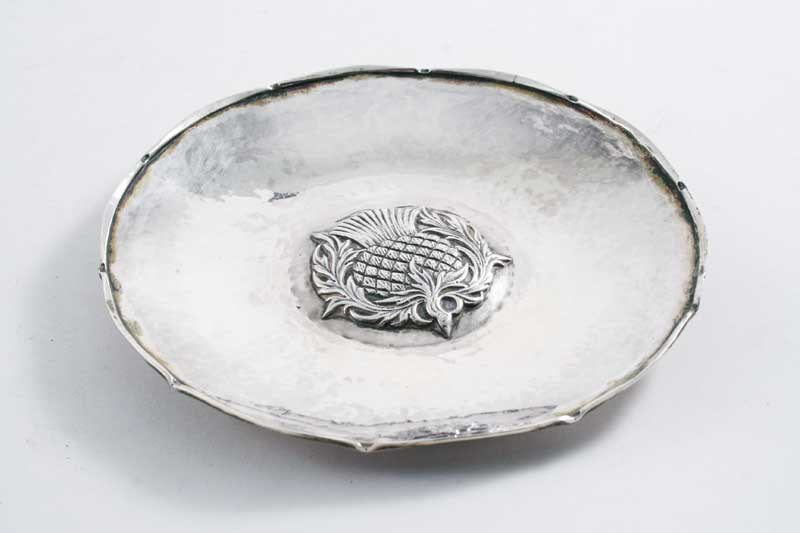 BY OMAR RAMSDEN: A small modern "hammered" dish with a thistle-head boss in the centre & a shaped circular border, the base incised "OMAR RAMSDEN ME FECIT", London 1927; 6" (15 cms) diameter; 4.4 oz