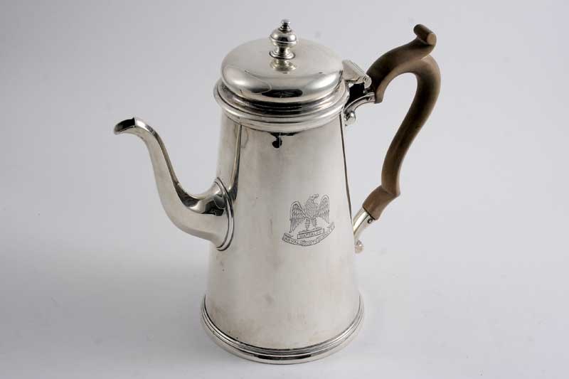 A modern tapering coffee pot with a cushion-domed cover & knop finial, engraved on one side with the badge of the Royal Scots Greys & inscribed on the other, maker's mark "HP" over "LP", London 1961; 9" (23 cms) high; 29 oz