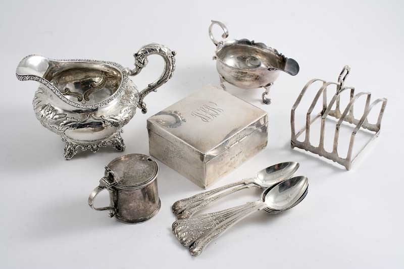 An early Victorian embossed milk jug, a George II small sauce boat, a small modern mustard pot (blue glass liner), a small toast rack, six King's pattern tea spoons, monogrammed & initialled and a square cigarette box, initialled; the latter 3.8" (9.5 cms); 21.3 oz weighable silver (11)
