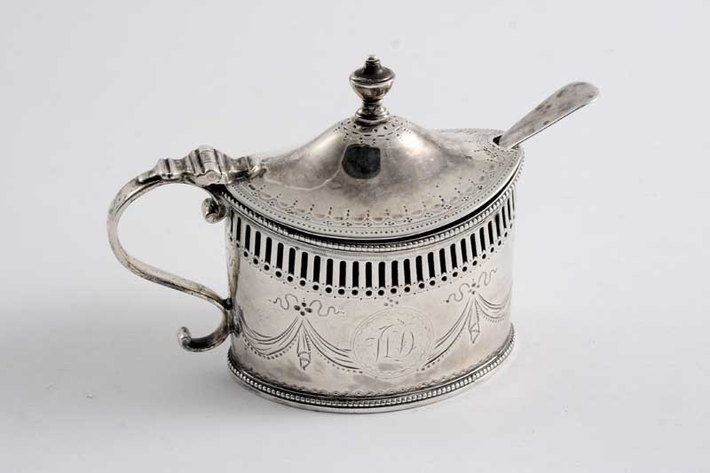 with pierced & beaded borders, a domed cover with a knop finial & a blue glass liner, initialled, by William Abdy, London 1787 (with a later, non-matching spoon); 3.25" 8.5 cms) high; 4.1 oz weighable silver