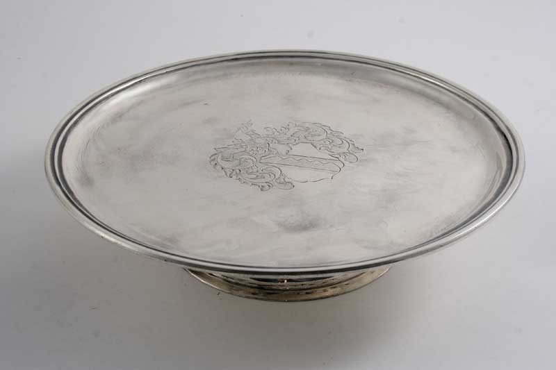 on a domed & spreading circular foot, with a plain moulded border & an engraved coat of arms in the centre, the reverse with scratchweight "16-16"; 9" (22.5 cms) diameter; 16.5 oz