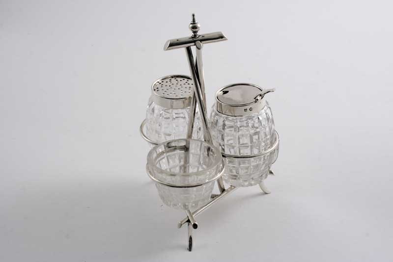 fitted with a mounted cut glass mustard pot, pepper caster & cut-glass salt, the frame initialled "R", no maker's mark, Edinburgh 1879; 6.25" (16 cms) high; 5.1 oz weighable silver