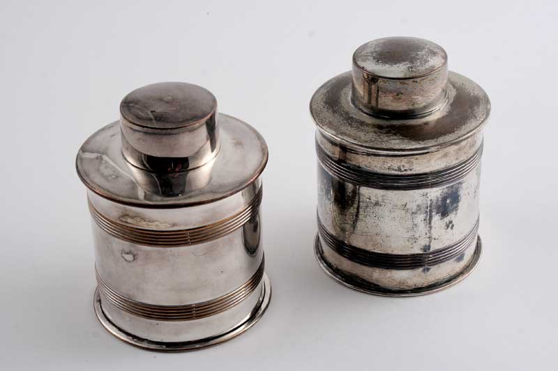 A PAIR OF OLD SHEFFIELD PLATED TEA CANISTERS with bands of incised reeding & pull-off caps, c.1800; 3.7" (9.2 cms) high