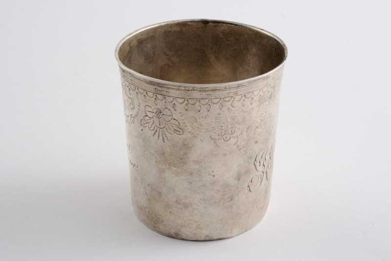 AN EARLY 19TH CENTURY FRENCH BEAKER with engraving, inscribed & initialled, maker's mark "TT", Paris c.1820; 2.75" (7 cms) high;