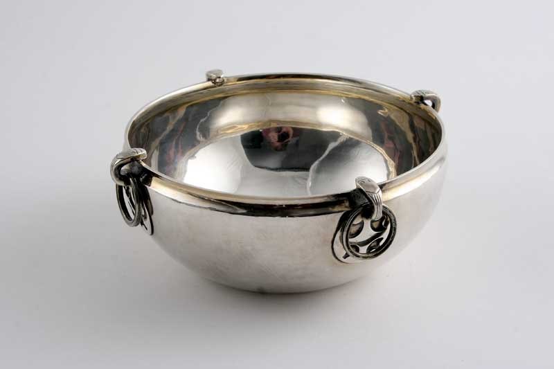 after the antique, with four animal mask drop rings around the sides, by Skinner & Co., London 1913; 5.5" (14 cms) diameter; 9.2 oz