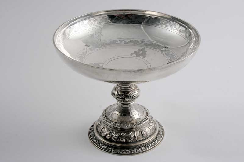 in the style of an Elizabeth I example with an embossed, domed foot & engraved decoration in the bowl, by Sebastian Garrard, London 1912; 8.2" (20.8 cms) diameter; 21.6 oz