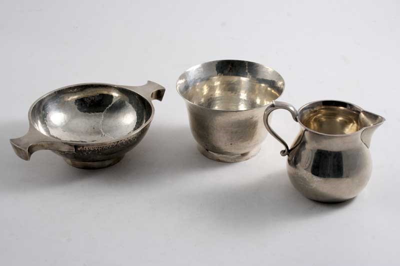 by E. Barnard & Sons, London 1966, a flared sugar bowl on a collet foot, by Stokes & Ireland, Chester 1932 and a quaich, inscribed, by A.E. Jones, Birmingham 1925; the latter 6.75" (17 cms) long; 18 oz (3)