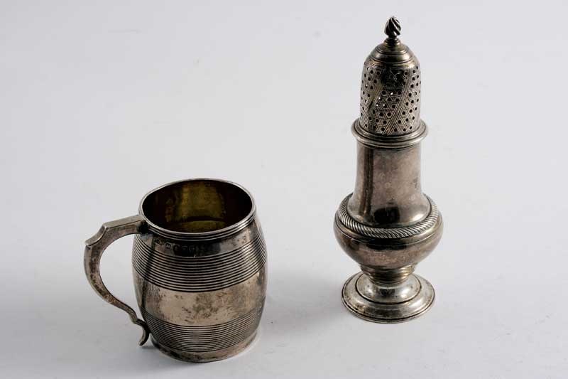 with a ropework border & a wrythen finial, probably by Samuel Welles, London 1764 and a small "barrel" mug, initialled, gilt interior, by Crispin Fuller, London 1810; the latter 2.75" (7 cms) high; 6.8 oz (2)