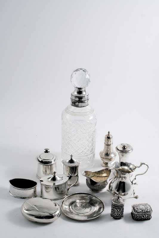 Six various condiments on oval "squeeze action" tobacco box, two cream jugs, a Chinese small circular dish, a small embossed box, a small Indian pot by Domersi Mawji of Bhuj, and a plated mounted cut glass decanter with lockable stopper (no key); the latter 10.3" (25.4 cms) high; 20 oz weighable silver (lot)