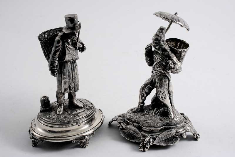 (possibly toothpick holders); one in the form of a street hawker wearing stovepipe hat & apron, with a wickerwork hod on his back, standing on an oval base with feet; the other in the form of a Robinson Crusoe figure with a parasol & a basket work hod on his back, standing on a leafy, shaped oval base, each figure struck only with a French export mark, c.1870; the latter one 5.75" (14.6 cms) high; 11.1 oz (2)