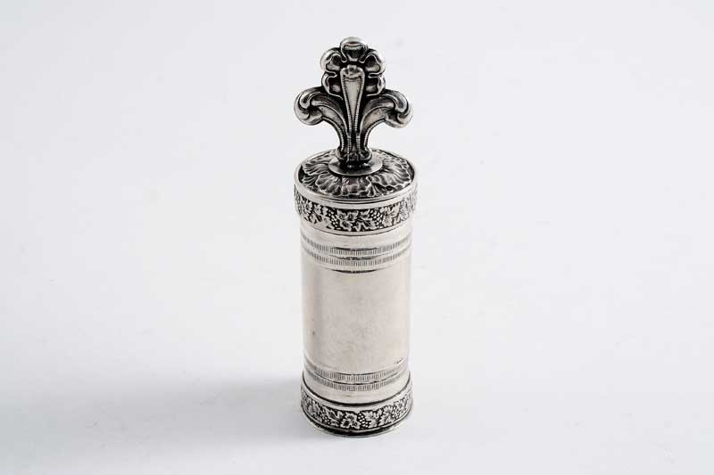 AN EARLY 19TH CENTURY GERMAN SMALL CYLINDRICAL SCROLL CASE with stylised flower finial & embossed borders of fruiting vines, the base initialled "FCS", maker's mark of "GRAVE", Leer 1820-40; 4.7" (11.8 cms) long; 1.9 oz