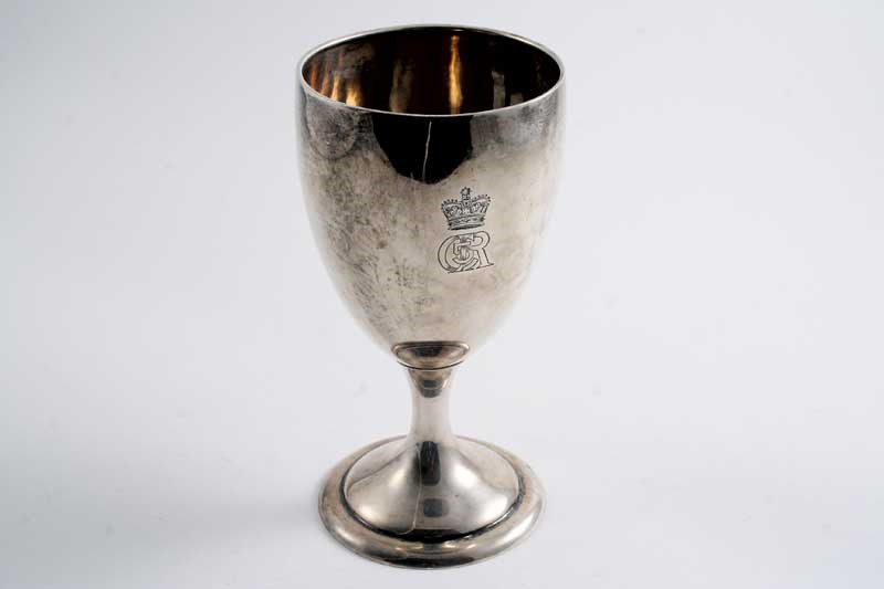 A late Victorian goblet, engraved on one side with the Royal Crown & cypher of the Connaught Rangers & inscribed "Captain C.H.D. Cass, 1st Batt. Connaught Rangers, 17th March 1900" on the other, by William Comyns, London 1899; 7.25" (18.5 cms) high