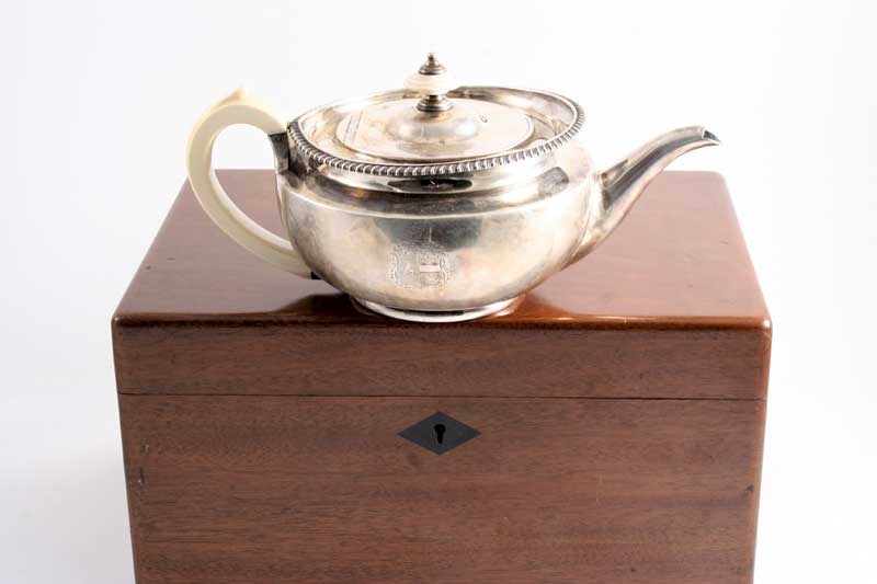 A GEORGE III CIRCULAR TEA POT with a gadrooned rim & an ivory handles & finial, engraved on one side with a coat of arms, by William Burwash, London 1816 (contained in a fitted box); 4'8" (12.3 cms) high; 23.4 oz