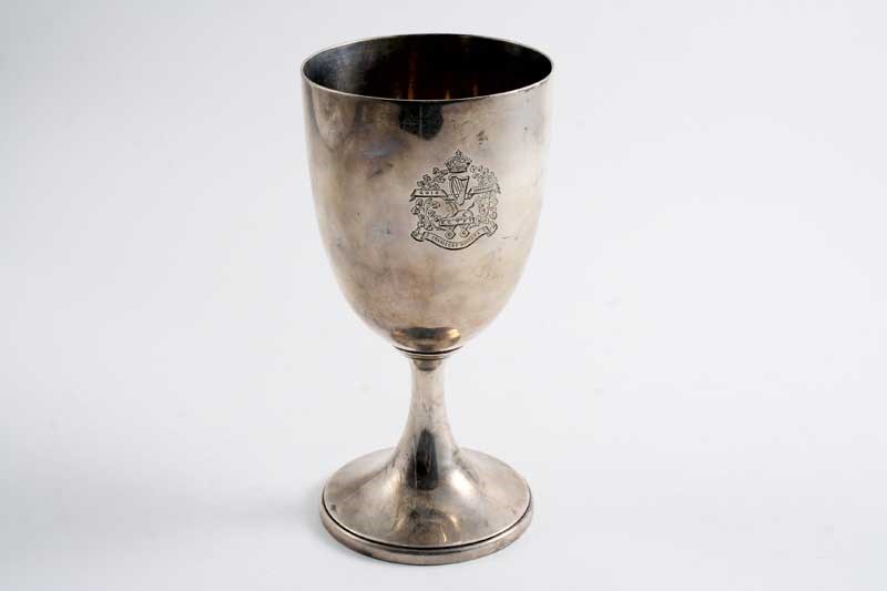 A Victorian goblet, engraved on one side with the badge of the 88th Regiment of Foot, the Connaught Rangers & inscribed "Presented to Lieut. A.H. Wood, 17th March 1876" on the other, by Stephen Smith, London 1875; 6.85" (17.5 cms) high; 8.9 oz