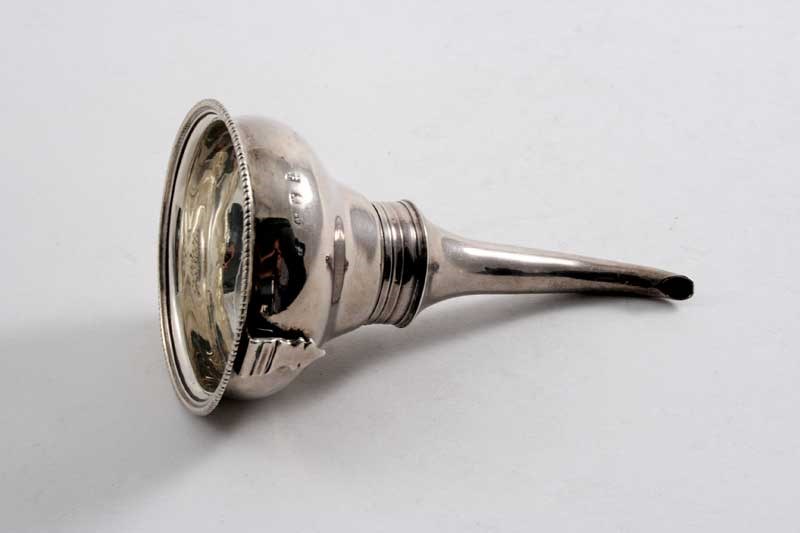 A GEORGE III WINE FUNNEL with a shaped tang & a slender, curved spout, maker's mark partially worn, London 1770; 4.35" (12 cms) long; 2.1 oz