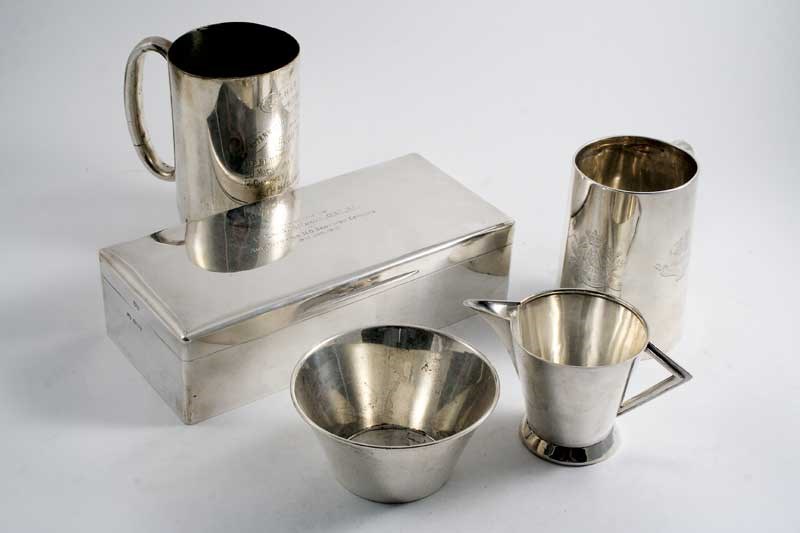 A modern oblong cigarette box, inscribed on the cover, cedar-wood lining, London 1939, a tapering mug engraved with two regimental badges, by Mappin & Webb, Sheffield 1897, a conical milk jug, a conical sugar bowl and a plated mug inscribed "CASHAR RACES 1894 INTERNATIONAL POLO TOURNAMENT"; the box 9.8" (25 cms) long; 18.4 oz weighable silver (5)