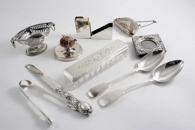 A matchbox mount, a small Art Nouveau purse, a Victorian pierced salt (no liner), a Victorian mounted cut-glass toilet box, crested, a small square frame, a circular pin cushion (loaded), a pair of sugar tongs, two table spoons, initialled & a cake knife; 14 oz weighable silver (10)