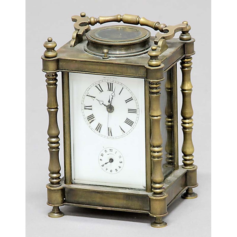 the enamelled dial with centre sweep seconds hand, subsidiary alarm dial on an eight day movement with repeater mechanism half hourly striking to a bell, the case with four turned columns, height excluding handle 17.5cm