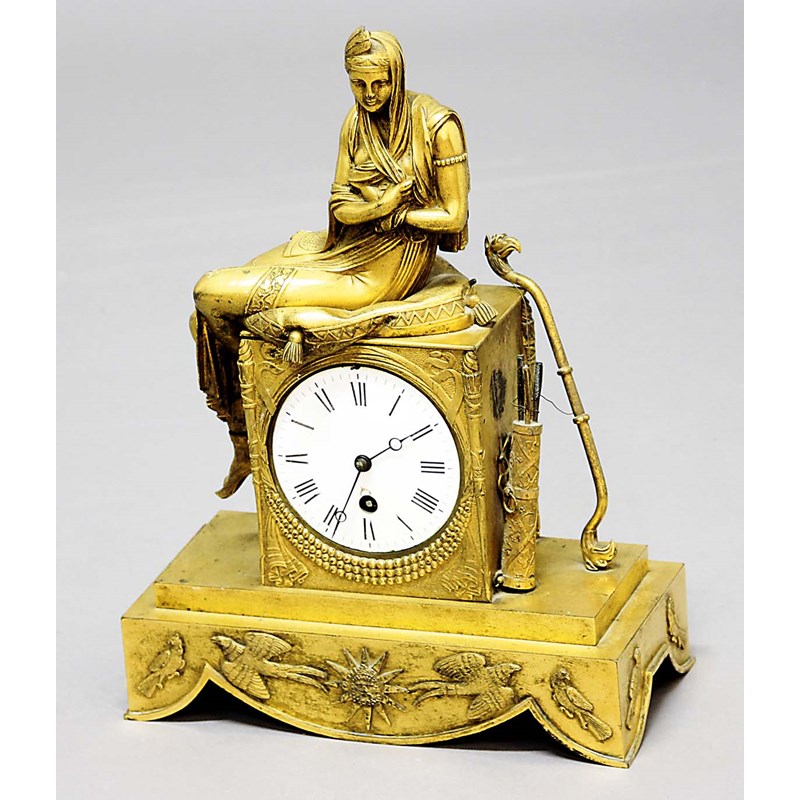 late 19th century, the 3 1/2" enamelled dial on a brass eight day movement, the case surmounted by a scantily clad Amazonian woman, her bow and arrows beside her, the base applied with a sun and parrots, height 35cm, width 25cm