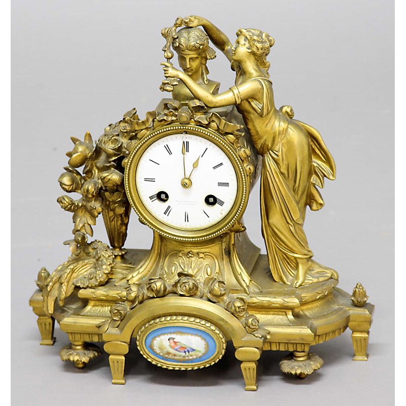 late 19th century, the 3" enamelled dial inscribed Alfred B Pearce, 23 Ludgate Hill, on a brass eight day movement half hourly striking to a bell and stamped Pert Bally Brevete A Paris, the case with a classical maiden draping a garland over a bust above a Sevres style plaque, on a carved and gilded wooden stand, height excluding stand 28cm, width 28cm