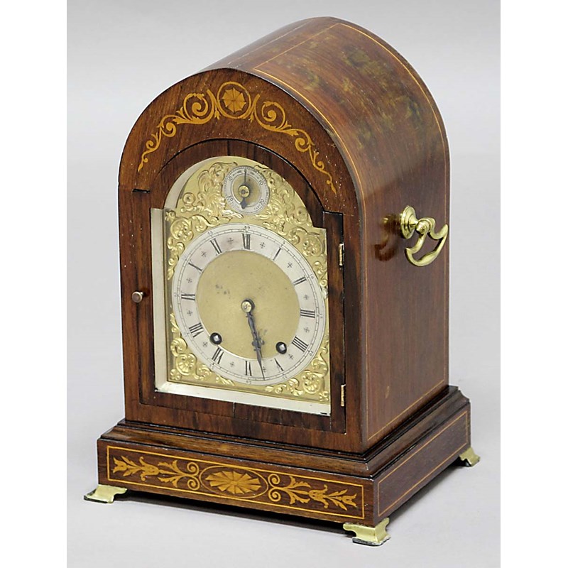 MAHOGANY AND INLAID LANCET MANTEL CLOCK,