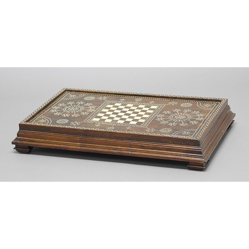 ANGLO INDIAN HARDWOOD CHESS BOARD, with bone inlaid board and star decoration, the moulded sides with a pair of drawers, height 10cm, width 65cm, depth 41cm