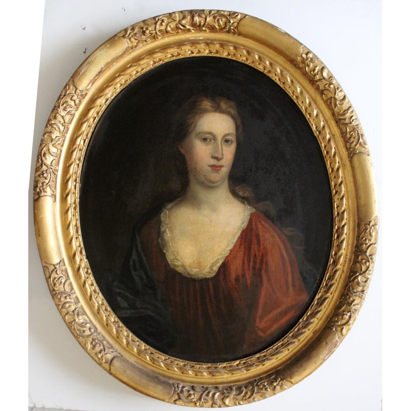A pair, each quarter length, he wearing armour and a white neckscarf, she wearing a russet dress and blue mantle, oil on canvas, oval