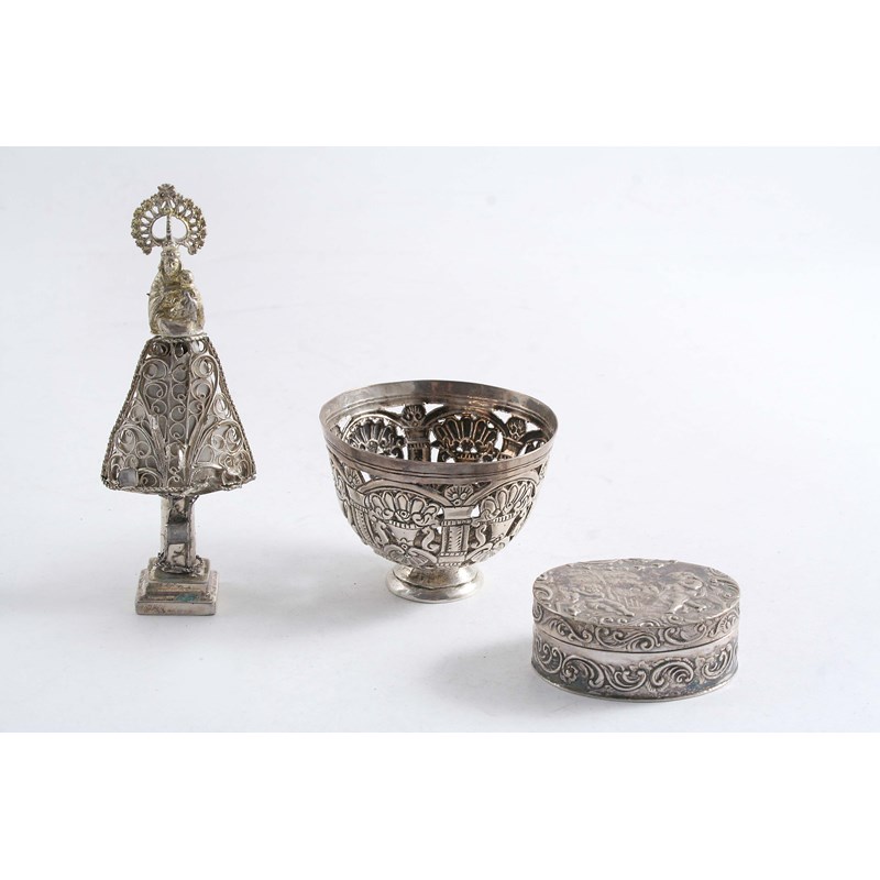 with a square base & filigree work, unmarked, a small decorative Continental oval box and a Continental pierced cup holder, probably 18th century, unmarked; the figure 4.5" (11.5 cms) high; 3.8 oz (3)