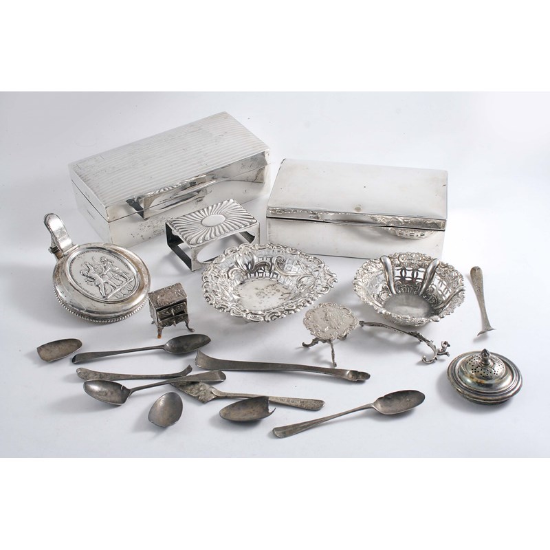 Two modern oblong cigarette boxes, a 19th century Swiss cover (from a tankard), two bonbon dishes, a Victorian matchbox cover, a decorative Continental miniature tripod table and chest of drawers, & various scrap; the larger cigarette box 7.3" (19 cms) long; 11.8 oz weighable silver (lot)
