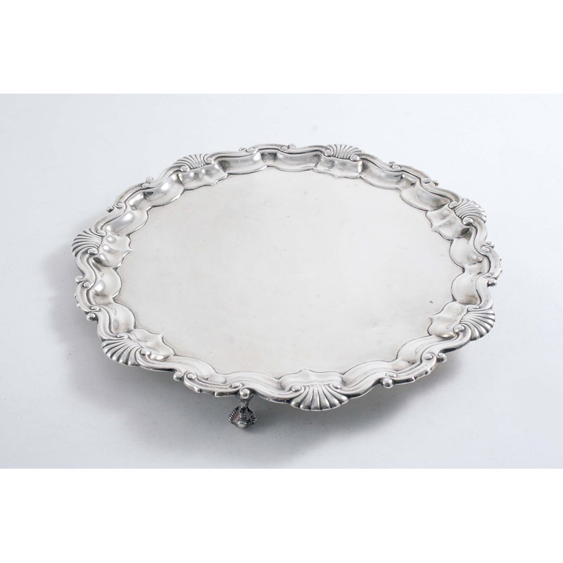 A LATE VICTORIAN SMALL SALVER with a shell & scroll border & ball and claw feet, by R. Martin & E. Hall, London 1890; 9.25" (23.5 cms) diameter; 13 oz