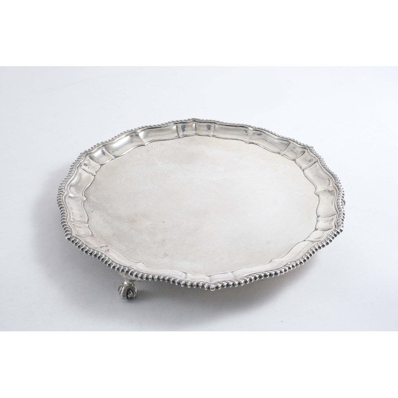 of shaped circular outline with a gadrooned border & ball & claw feet, by H. Atkin, Sheffield 1936; 9.7" (24.5 cms) diameter; 19.9 oz