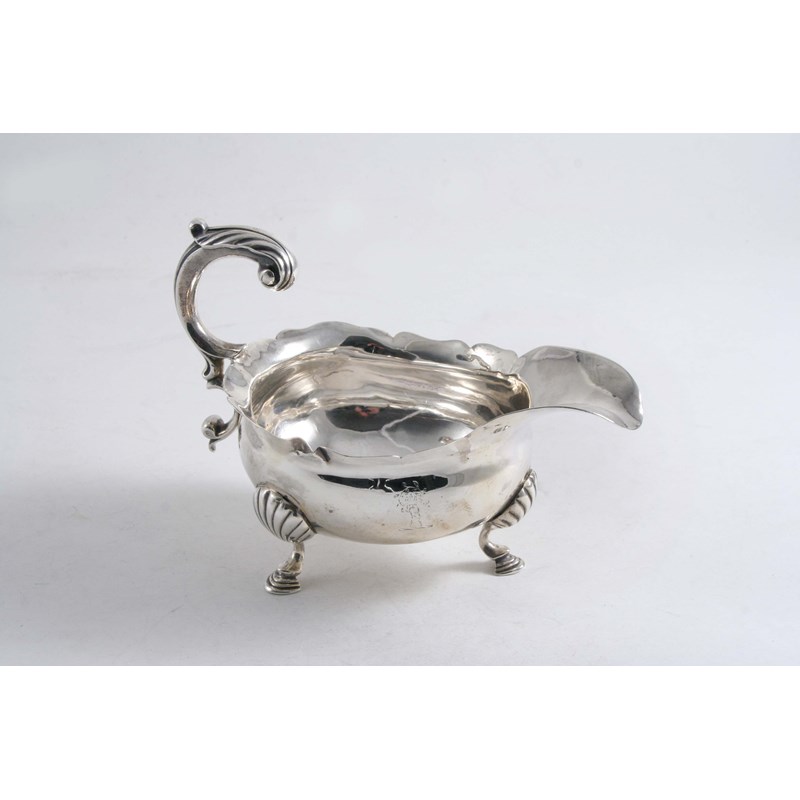 on three feet with a shaped rim, a leaf-capped, scroll handle & engraved crest, maker's mark partially distorted, probably by William Grundy, London 1756; 6.75" (17.2 cms) long; 9.75 oz