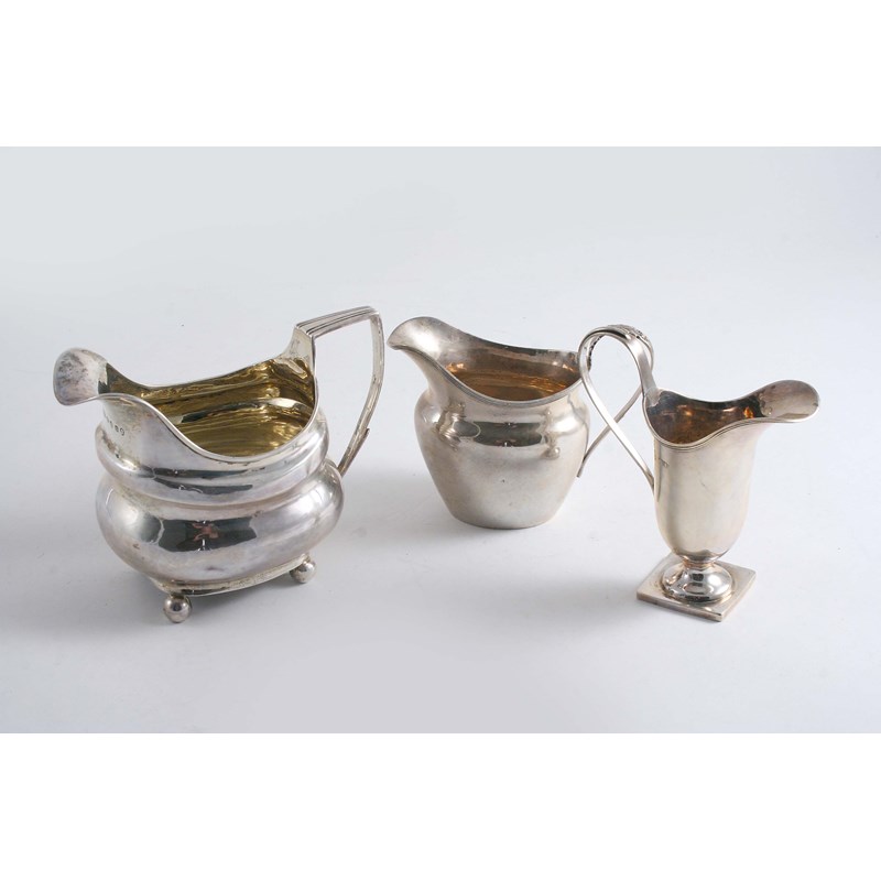 on ball feet, crested, gilt interior, by Alice & George Burrows, London 1808 together with two other late cream jugs; the former 4" (10 cms) high; 9.9 oz (3)