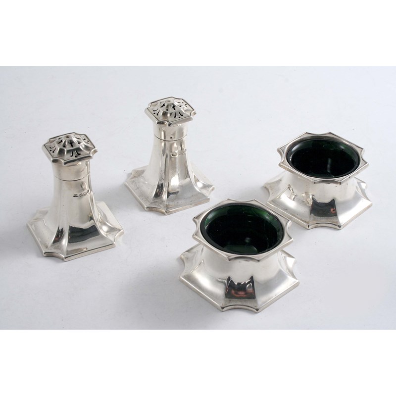 Two peppers & two salts (with green glass liners, one A/F) on square bases with incurved corners & waisted sides, maker's mark worn, "RFM?", Sheffield 1912; the peppers 3" (7.5 cms) high; 6.1 oz weighable silver