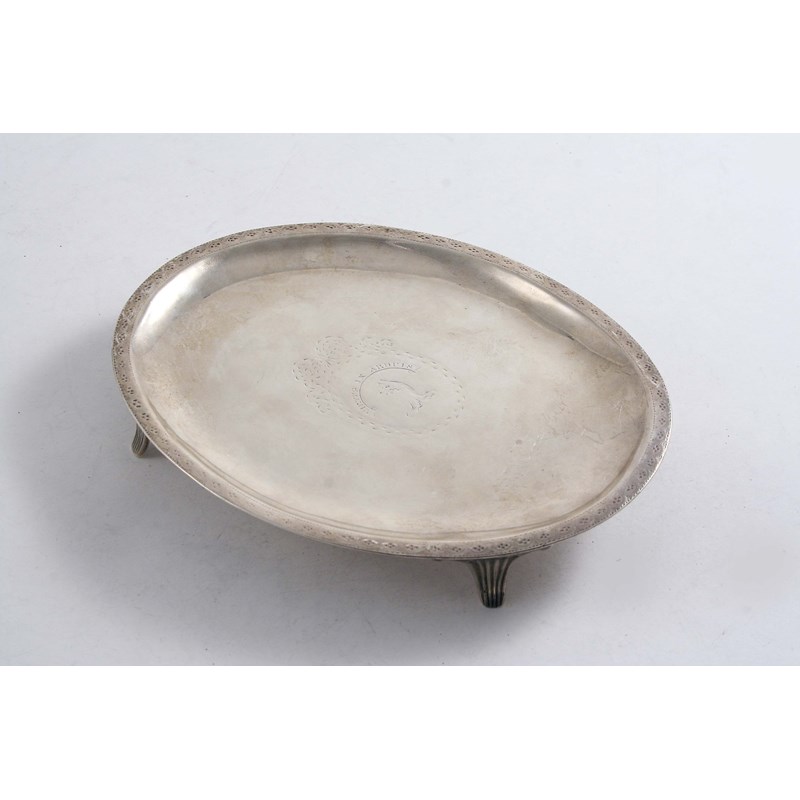 A GEORGE III SCOTTISH TEA POT STAND oval, on four fluted feet with an engraved border & central cartouche, engraved crest & motto "VIRTUS IN ARDUIS" by Patrick Robertson, Edinburgh 1789; 7" (17.7 cms) long; 5.25 oz