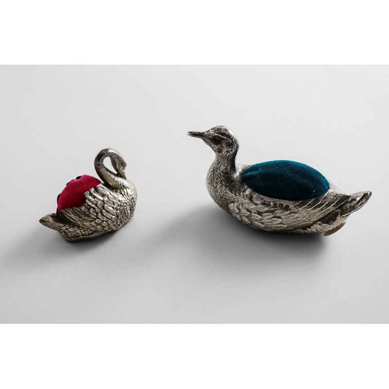 in the form of a swimming duck, by Levi & Salaman, Birmingham 1909 and another smaller silver pincushion in the form of a swimming swan, by the same maker, Birmingham 1903; the latter 2.2" (5.5 cms) long (2)