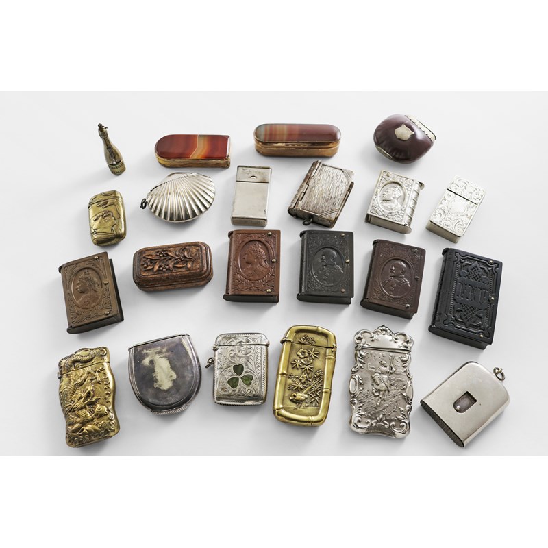 Four commemorative vulcanite vesta cases (King Edward VIII & Queen Victoria), another vulcanite vesta "Feu", two giltmetal and banded agate vesta cases, nine various plated vesta cases, a brasss "bottle" cigar cutter, a carved wooden vesta case, a mounted Australian nut vesta case and three Japanese brass vesta cases c.1900; the largest one 2.75" (7 cms) long (22)