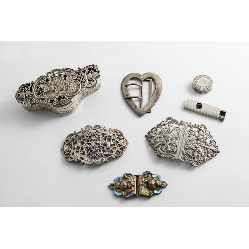 with a coach scene & wedding bells on the cover, by William Comyns, London 1908, a silver-mounted steel cigar cutter, a pair of silvergilt and enamel buckles or belt terminals, a George III small silver patch box, initialled, a silver two-piece buckle and a plated two-piece buckle; the pot pourri box 5" (13 cms) long; 7.1 oz weighable silver (7)